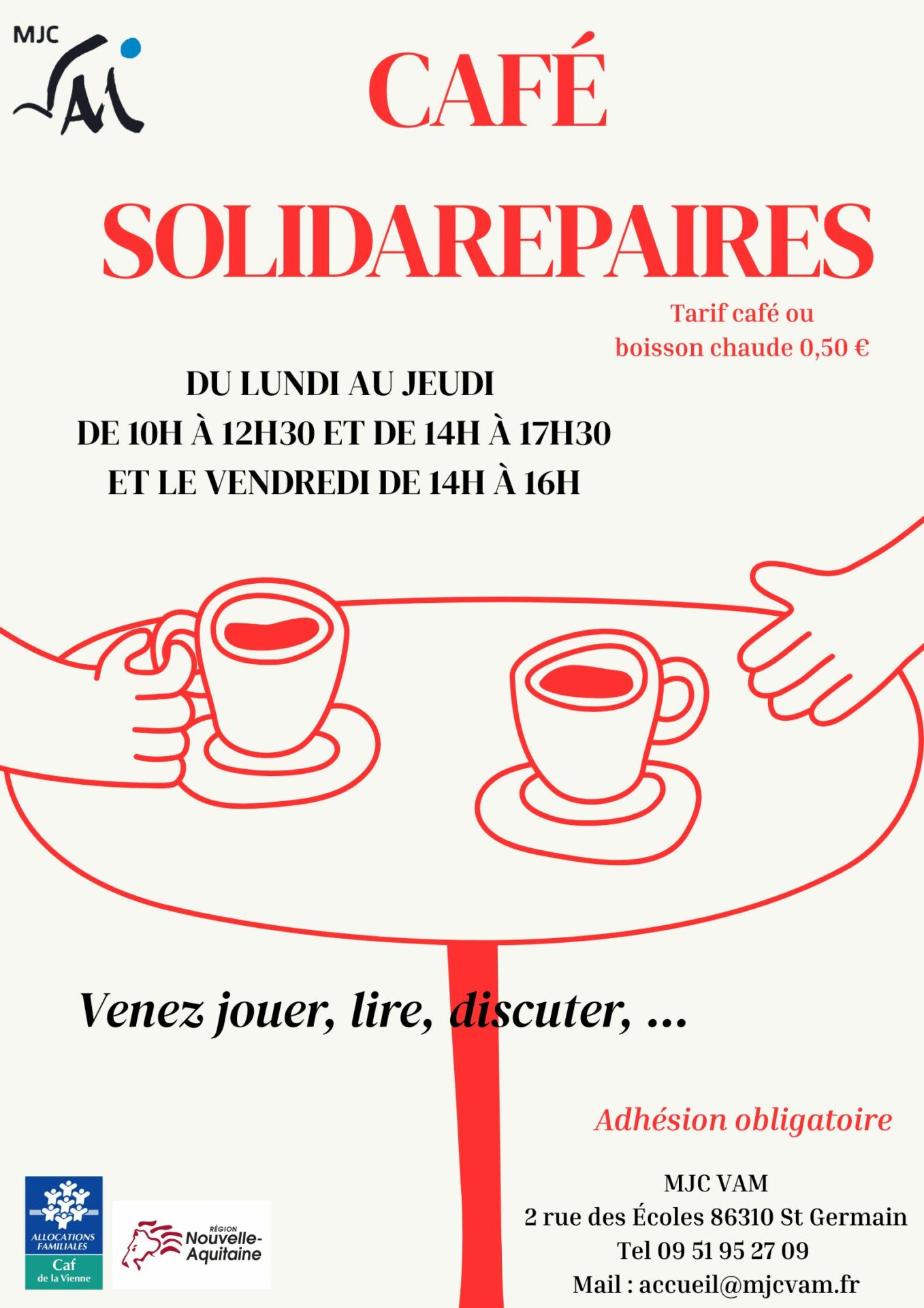 Café SolidaRePaiRes 10 octobre 202510 octobre 2025| accueilaccueil| 0 commentaire | 12 h 25 min Categories: Animations Vie associative Laissez un message Annuler la réponseVotre adresse e-mail ne sera pas publiée. Les champs obligatoires sont indiqués avec *Commentaire * Nom * E-mail * Site web Navigation de l’article Précédent Article précédent : Recherche de bénévoles pour le CLAS Related Post Conférence gesticulée « On laisse pas Pépé dans un coin ! »Conférence gesticulée « On laisse pas Pépé dans un coin ! » 2 décembre 20242 décembre 2024| accueilaccueil| 0 commentaire| 15 h 44 min Lire la suiteLire la suite Théâtre enfant à compter du 5 novembre !Théâtre enfant à compter du 5 novembre ! 24 septembre 202524 septembre 2025| accueilaccueil| 0 commentaire| 11 h 47 min Lire la suiteLire la suite Les T.R.U.C.s sont disponibles à la location !Les T.R.U.C.s sont disponibles à la location ! 4 juillet 20244 juillet 2024| accueilaccueil| 0 commentaire| 16 h 51 min Lire la suiteLire la suite