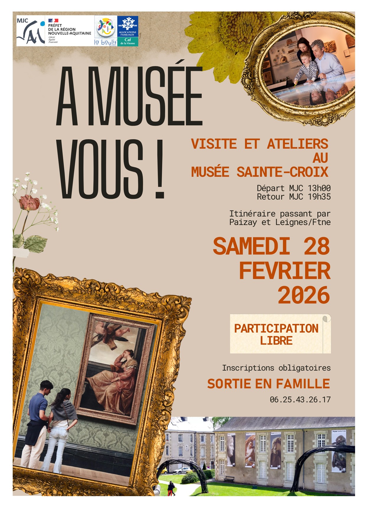 A musée vous ! Samedi 28 février 2026 12 février 202612 février 2026| accueilaccueil| 0 commentaire | 9 h 08 min Categories: Animations Enfance Famille Laissez un message Annuler la réponseVotre adresse e-mail ne sera pas publiée. Les champs obligatoires sont indiqués avec *Commentaire * Nom * E-mail * Site web Navigation de l’article Précédent Article précédent : Programme vacances de février au secteur jeunes Related Post Vacances Octobre AdoVacances Octobre Ado 12 octobre 202112 octobre 2021| jeunessejeunesse| 0 commentaire| 18 h 17 min Lire la suiteLire la suite RECHERCHE BENEVOLESRECHERCHE BENEVOLES 5 avril 20235 avril 2023| accueilaccueil| 0 commentaire| 16 h 52 min Lire la suiteLire la suite Action d’autofinancement menée par les jeunesAction d’autofinancement menée par les jeunes 17 avril 202517 avril 2025| accueilaccueil| 0 commentaire| 9 h 52 min Lire la suiteLire la suite